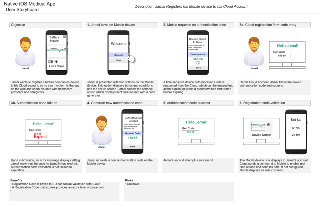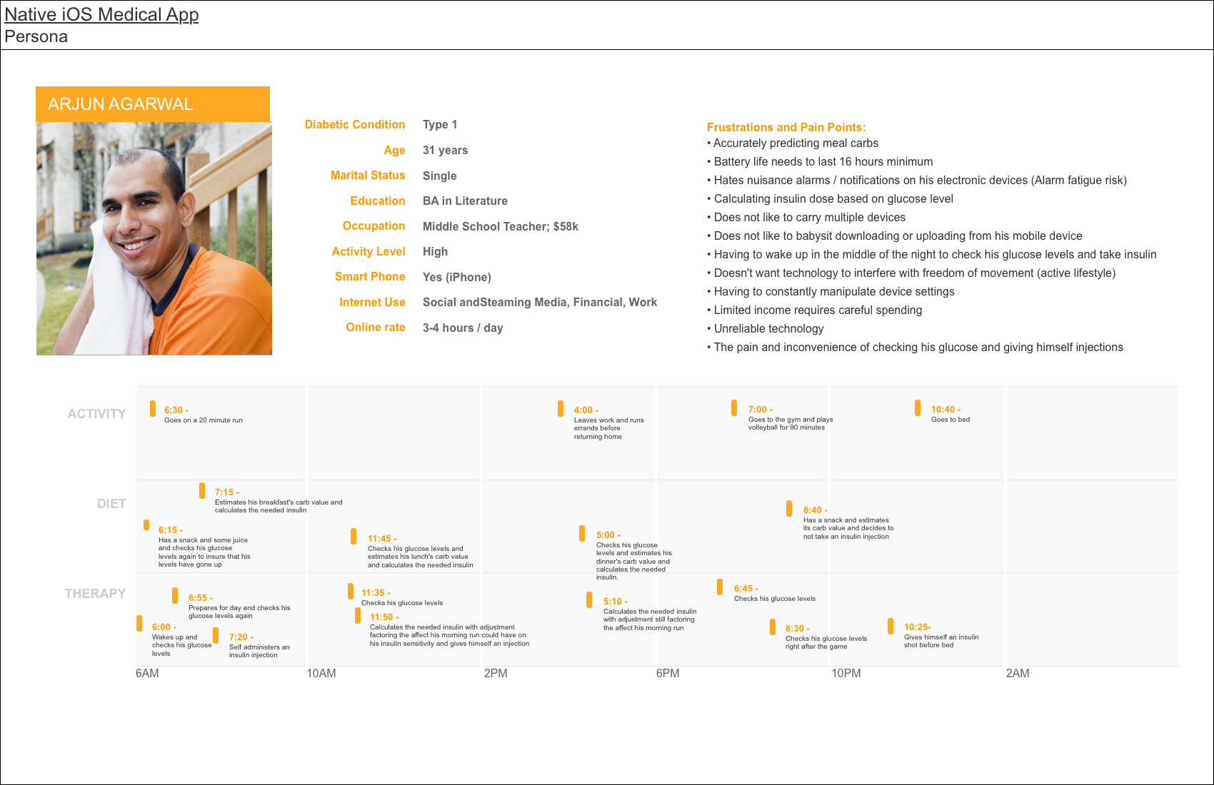 This project targeted end users which needed a native iOS application that managed diabetes insulin therapy being delivered via a wearable device. Funding for this project was placed on hold and I had left the project prior to completion. Content has been altered and client references have been sanitized from samples to maintain anonymity.