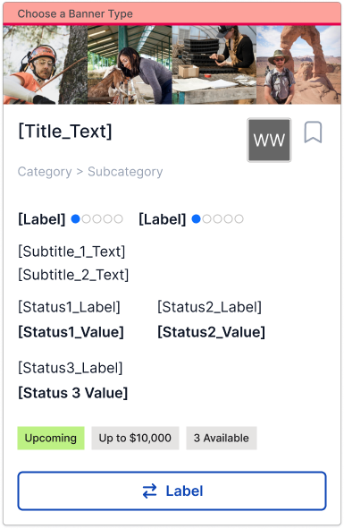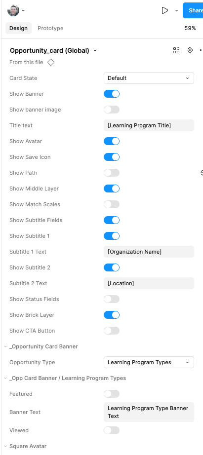 Scalable and responsive components were created from base widgets for search page headers, backgrounds, filter panels, and results cards. The base component for the result card was designed to be universally scalable across all opportunity types (jobs, events, careers, organizations, etc…) By using properties, designers quickly could turn on / off card attributes to support the need of the target opportunity. This approach was discussed with and welcomed by the dev team.